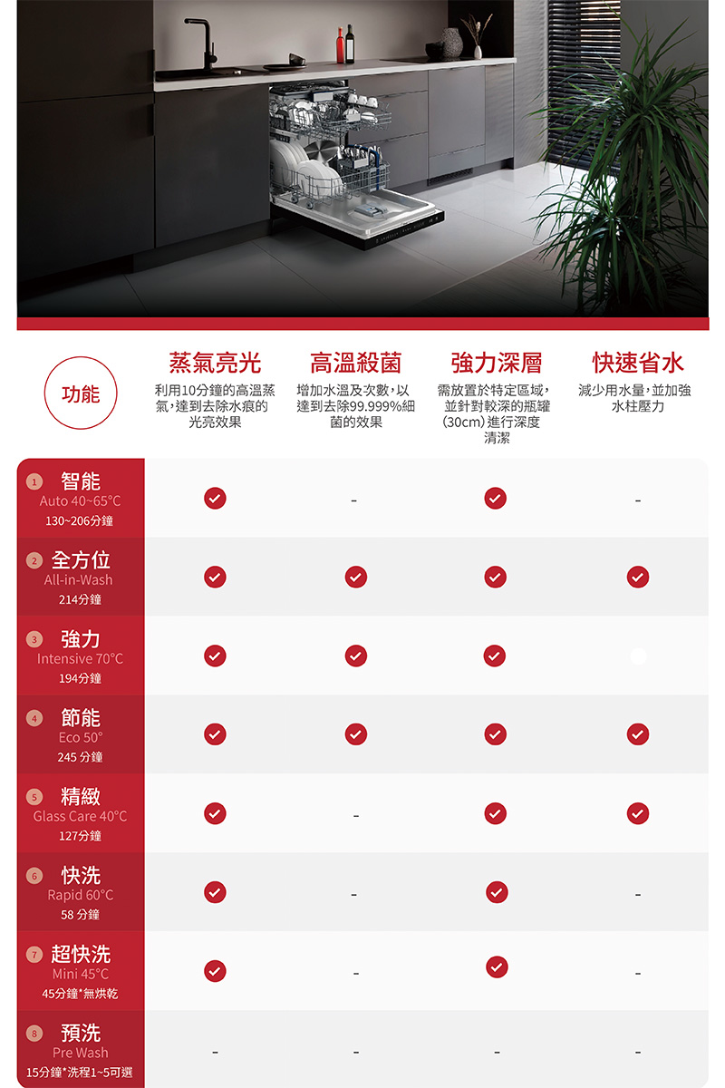 | 智能洗程 | 40~65°C (152-198 分鐘) | v |