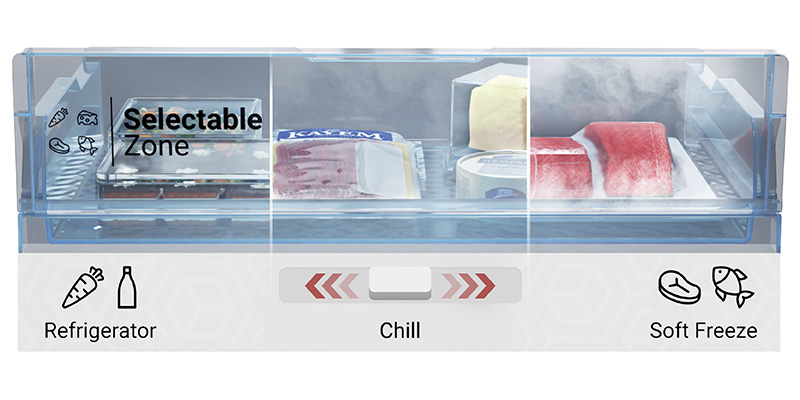 .微凍(約-3°C): 保持肉類與魚類新鮮,易切分、免解凍即可烹調。 .冰溫冷藏肉類(約 0°C): 低溫保存乳製品與肉類,更長時間保鮮 .新鮮冷藏(約 3°C): 切換成冷藏模式,立即增加飲品與食物的收 納空間